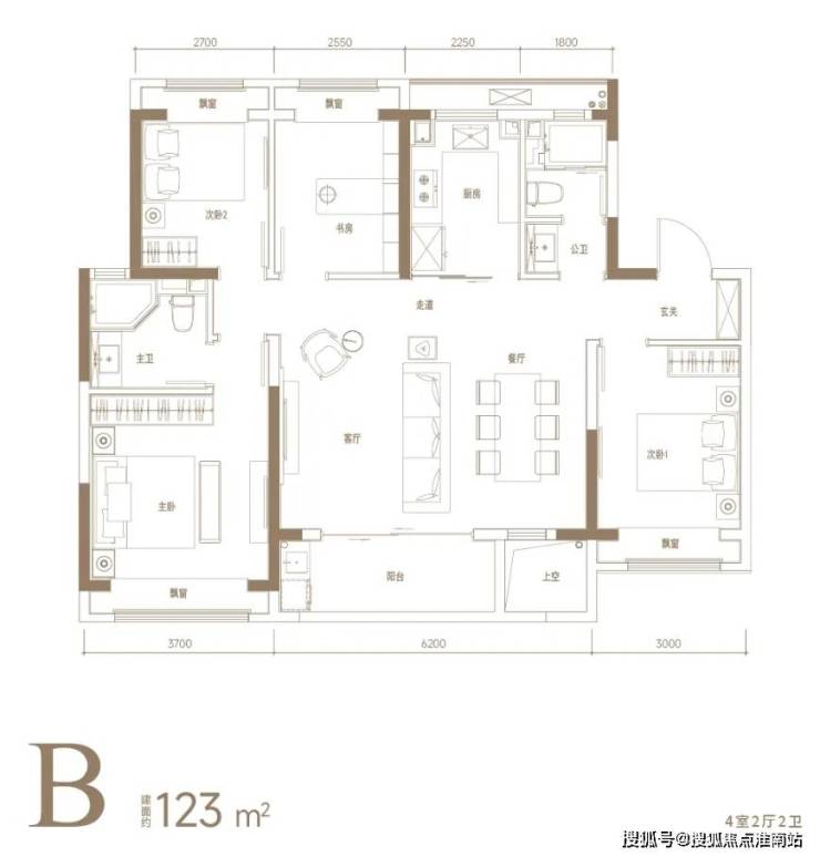 建面约123㎡做到了4房,且客厅面宽达 6.2米,主房间宽达 3.7米,且北面2间小房间根据需求可打通。