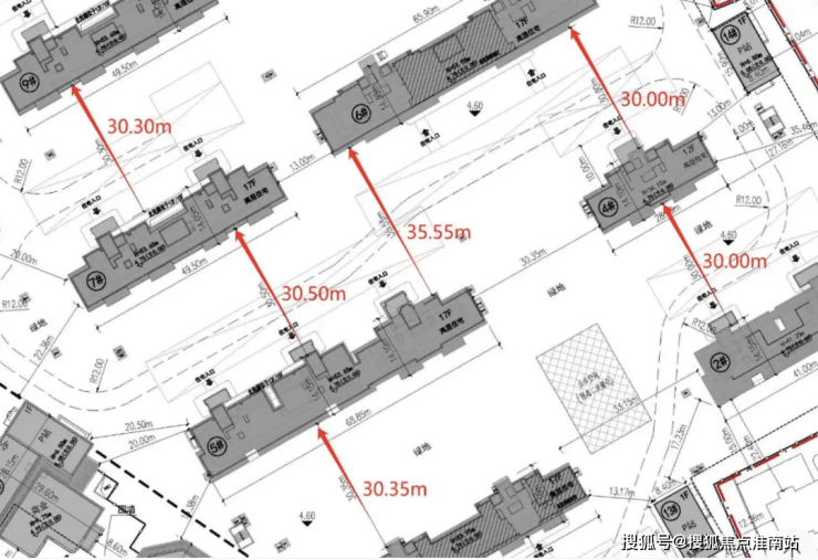 从楼栋排布来看,楼间距大约在30米左右,最大为35.55米。按照相关规定,房屋前后间距比例应保持在1:1.2,但该项目的楼间距只有楼高的0.56。