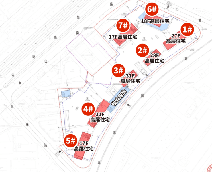 根据设计方案显示,项目拟建设7幢高层住宅、1幢物业管理用房以及相应的配套设施(自持菜场、老年活动室、文化活动室),其中1#总高27层,2#总高28层,3#、4#总高31层,5#、7#总高17层,6#总高18层,每栋楼均首层局部架空。