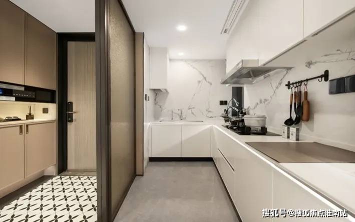 厨房的操作台面、背景墙都采用大块岩板,方便清理油污,同时又大气美观。