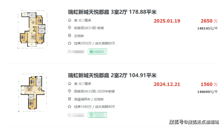 小胖君特意查了下,2020年建成的瑞虹新城天悦郡庭的成交价,179㎡户型成交单价约14.8万/㎡。