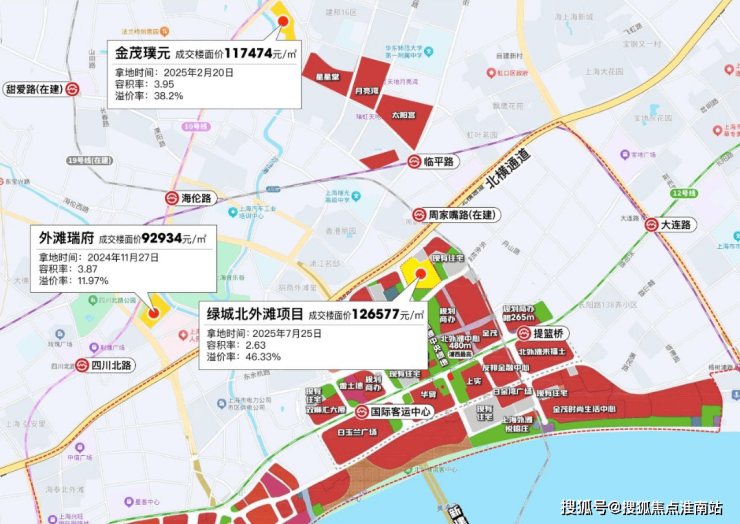 最终在第二轮竞价环节,绿城以64.72亿总价锁定胜局,溢价率46.3%,成交楼面价126577元/㎡,加冕虹口新的单价地王!