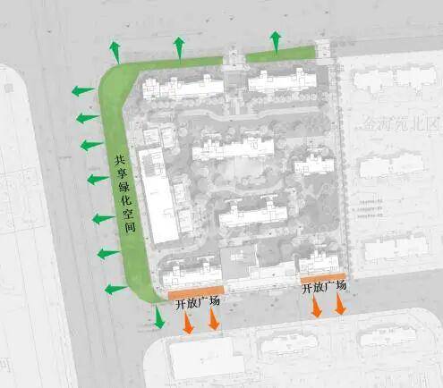 基于本地块商业、居住、配套的综合属性,通过轴线设计与空间规划串联住区、商业广场、街角公园,形成步行尺度适宜的开放共享空间,打造“商”、“住”、“学”、“行”、“游”的沿街友好的“好房子”邻里氛围。