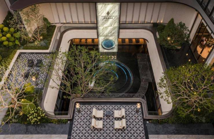 作为整个序列的高潮,琉璃光院历经多轮方案推敲,最终以汉白玉玄月族徽与10米高蓝水晶光幕构成“日月同辉”意象。院中矗立50年乌桕树,漩涡水景“宇宙之心”借鉴梵蒂冈博物馆双螺旋楼梯,隐喻宇宙生生不息的力量。