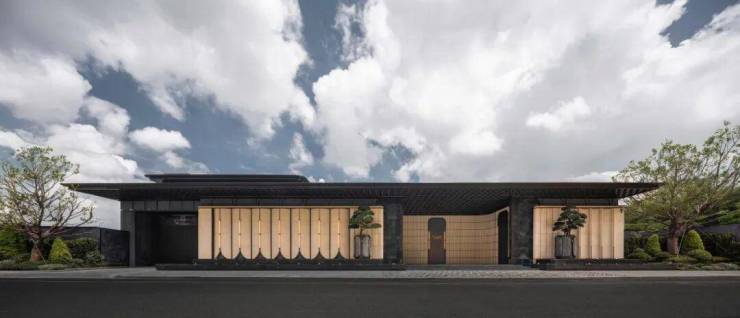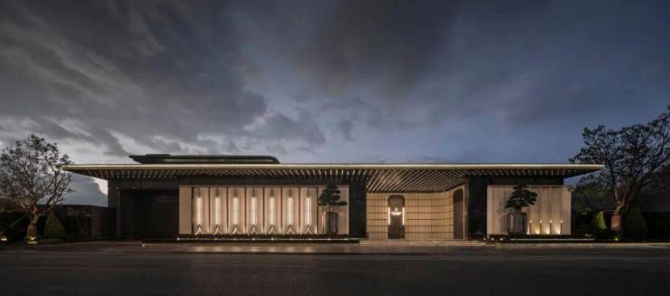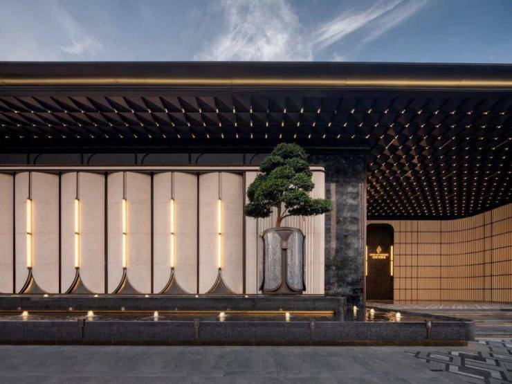 入口大门长达54米,高约8米,结合超过300㎡的星空顶棚,以1286块浅米色陶瓷背景墙融入奉贤非遗锔瓷技艺。地面选用黄金丝绸奢石铺装,对称布置老桩茶梅,隐喻礼迎贵客,营造极具仪式感的归家体验。