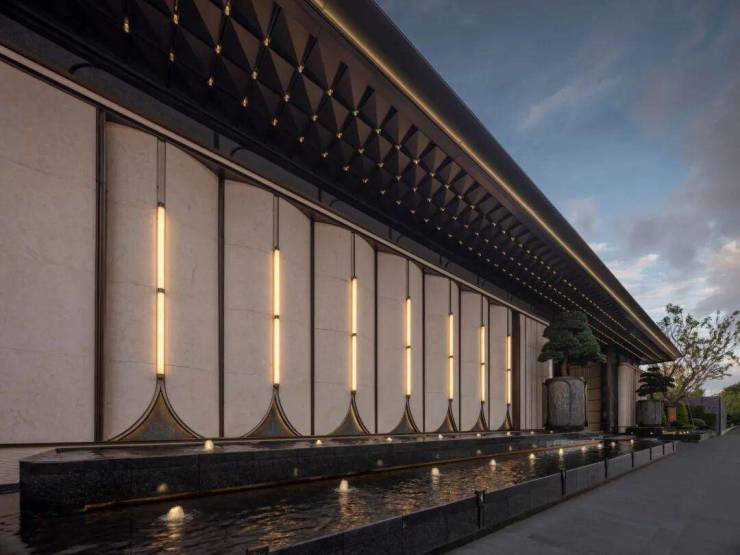 建筑立面汲取经典海派建筑的柔美元素,通过微弧倒角、曲面收边等工艺将曲线抽象为现代建筑语言。米白色金属、古铜色金属与灰色真石漆相结合,以画框式构图消解体量,形成古今融合的精致效果。