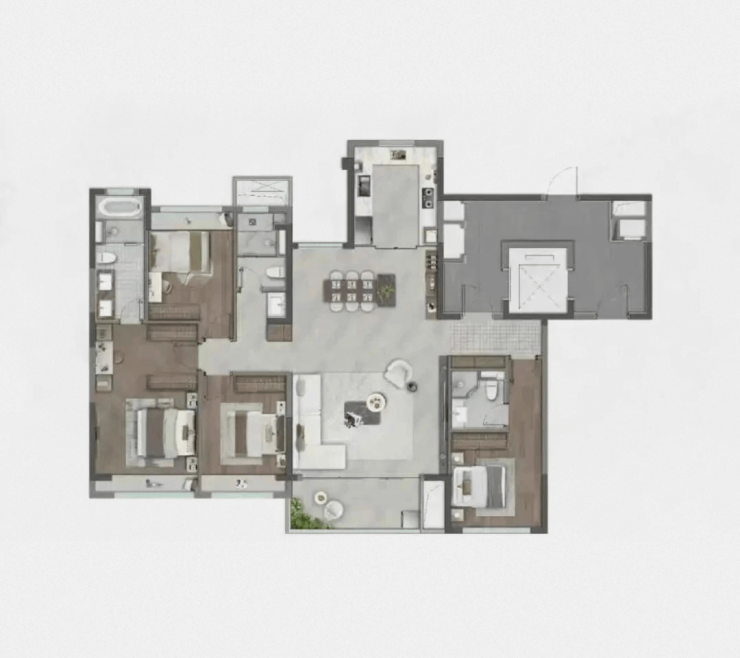 175洋房户型15.4m南向采光面宽,央景楼王视野,南北通餐客大方厅,豪华四房预留丰富生活场景