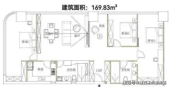 3、1004室:【户型】:3/2/2【面积】:169.83m²【价格】:单价5.3万 总价899万【参数】:得房率87%,面宽6米,全屋进深25米,层高3米【1004室介绍】:全明户型,每个房间都有窗户,餐客厅一体,动静分离双主卧设计,朝西看小区中心花园,3房2厅2卫再多送一个定制化多功能间。