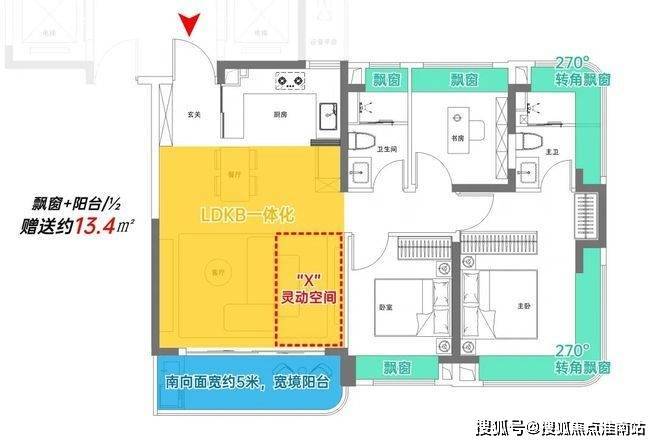 经典动静分离户型,LDKB一体化设计,三开间朝南,南向整体面宽约11米,搭配约5米宽境阳台;