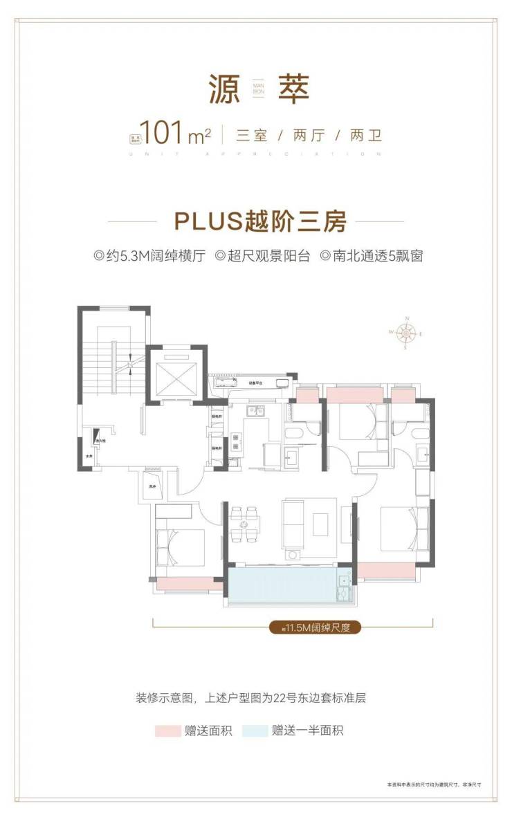 三居:建面约101㎡(3室2厅2卫,南北通透,约5.3M阔尺横厅)