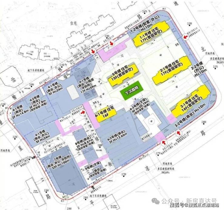 住宅部分:规划为15-17F小高层住宅产品,楼间距非常充足。社区内部设置了底部架空层和下沉庭院(应该是会所)。部分文保建筑保留现状、修缮,也为项目平添文化底蕴。