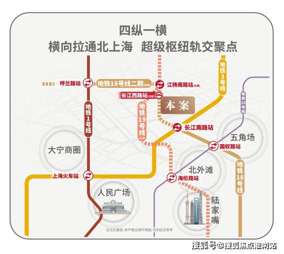 地铁18号线横向拉通了原本纵向不相连的四线地铁:1/3/18/19,将北上海横向联通,成为区域轨交的交汇聚点;项目紧邻长江西路地铁站(直线距离约150米),1站江杨南路,5站复旦,7站五角场。