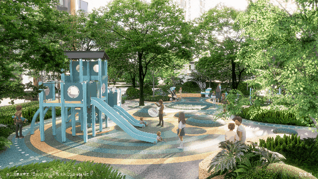 社区的功能性和仪式感十足, 整体打造了生活林荫双轴、能量聚场以及五重归家礼序。内部打造了阳光草坪、微风客厅、林间乐园、社交盒子等公共活动空间,为业主提供可赏、可玩、可聚的各种雅致生活场景,业主下楼就能开启多样健康社区生活。