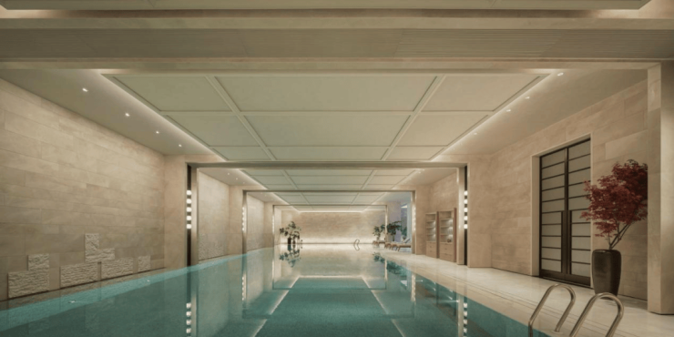 再比如,总面积高达约3000㎡的泛会所空间。包含地上1200㎡位于架空层约6米挑高空间与1800㎡的下沉式会所。考虑到项目总共只有324户,会所浓度在上海名列前茅,覆盖有作家书房、游泳池、瑜伽室、健身房、私宴厅等逾10种功能空间。