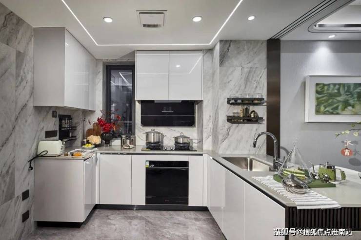 开放式厨房设计,三面环形的台面,洗涤区、烹饪区及操作台等空间划分明确。配备方太三大件,摩恩水槽、高仪龙头,即便多一个人在厨房里帮忙,也不会拥挤。方寸之间,为家人营造一方美味空间。