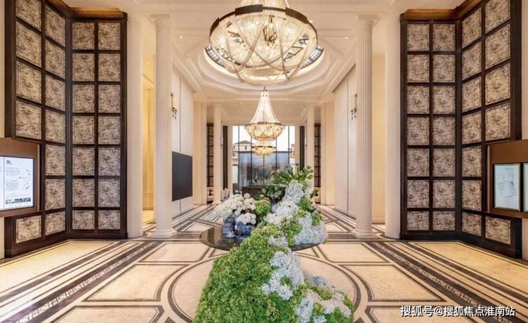 预接待厅地面瓷砖采用 威尼斯白与 爵士白石材拼花设计,纯人工铺装保证花纹的奢华质感。甚至壁面装饰的水晶灯,都选用高规格的E9级进口水晶制作。