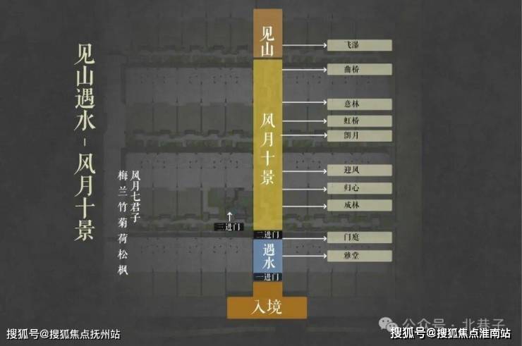 中国人自古讲究归家礼序,门第之尊;久映颂月将传统中式建筑的礼序空间融入整体的规划布局中,形成一坊八巷-置坊入巷-穿巷入户的三重归家礼序。