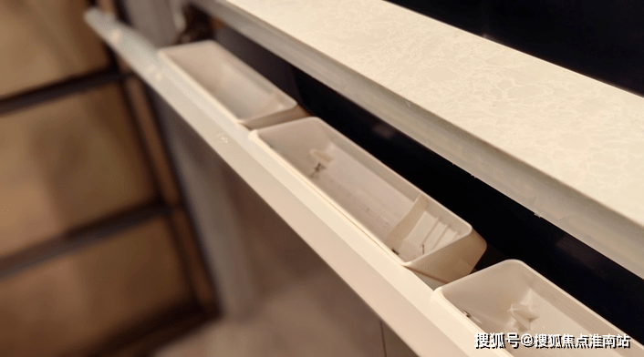 甚至在水槽前的柜门上,也巧妙的制定了三只袋鼠抽收纳来储放清洁用品,不仅保证了厨房的丰富作用,并且让整个空间光洁有序。甚至在浴室的盆柜下也做了袋鼠抽,便捷储放口红和护肤品。