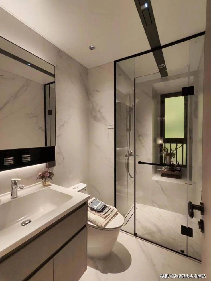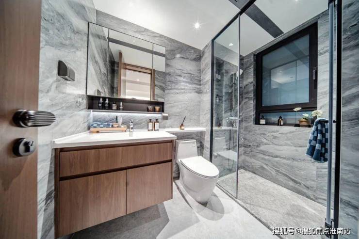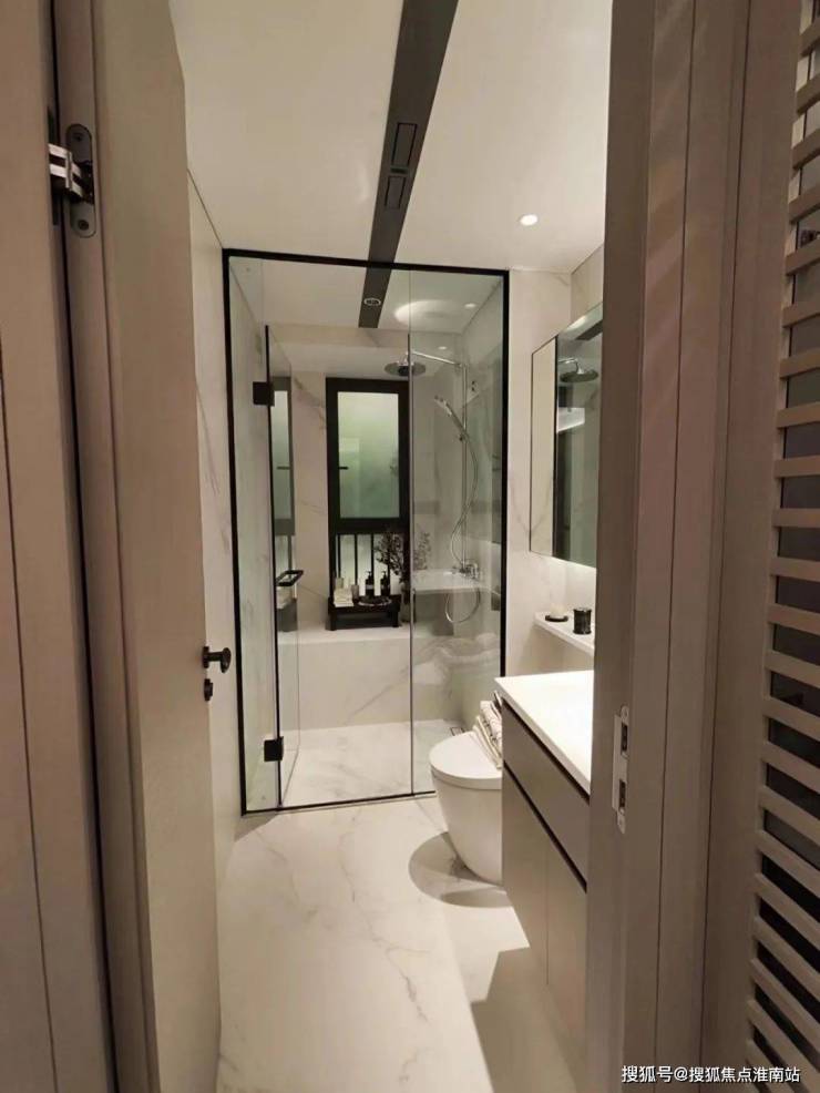 洗手间壁龛存放空间。洗手间上边增设了壁龛,淋浴室也设置了存放壁龛,具备存储功能。乃至在每个主浴室都做了一个美容冰箱,让女主的面膜、护肤品等更方便的存放。