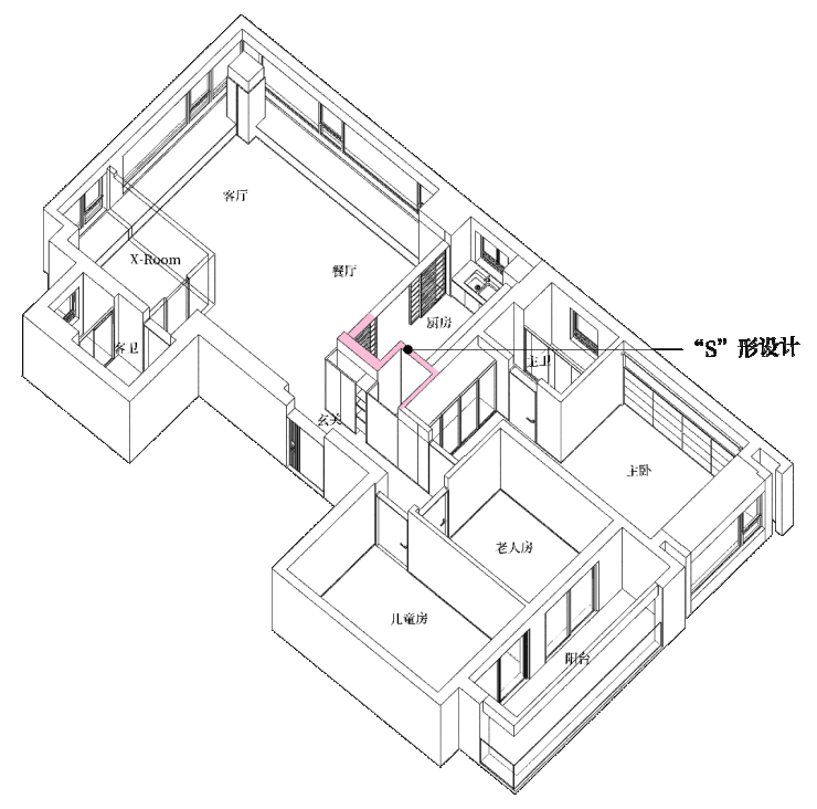 设计亮点:①通过独特的“S墙”设计,不但能改善存放空间,也可以用来挪动“冰箱”,扩张厨房操作空间,提升厨房的存储量,使原先的中小型L型厨房变为U型厨房。