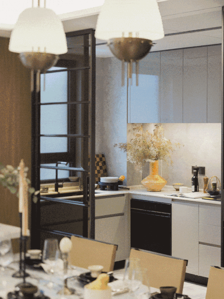 比如,依据玻璃移门,整个厨房空间可以在封闭/半开放/开放中间自由切换。