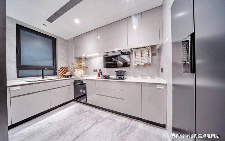 考虑到空间透水性,厨房分户墙“S“样子设计,选用凹凸墙,置入壳体空间,更好地发挥展现和储存功效,将L型厨房升级成U型厨房。