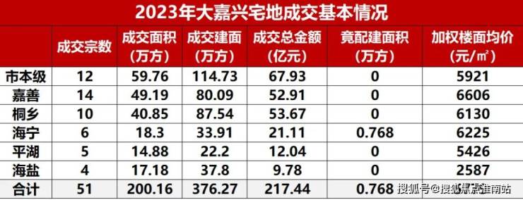 2023年,大嘉兴成功出让 涉宅用地51宗(含住宅、商住、安置等地块,下同),总成交土地面积约199.22万方,揽金约217.44亿元。