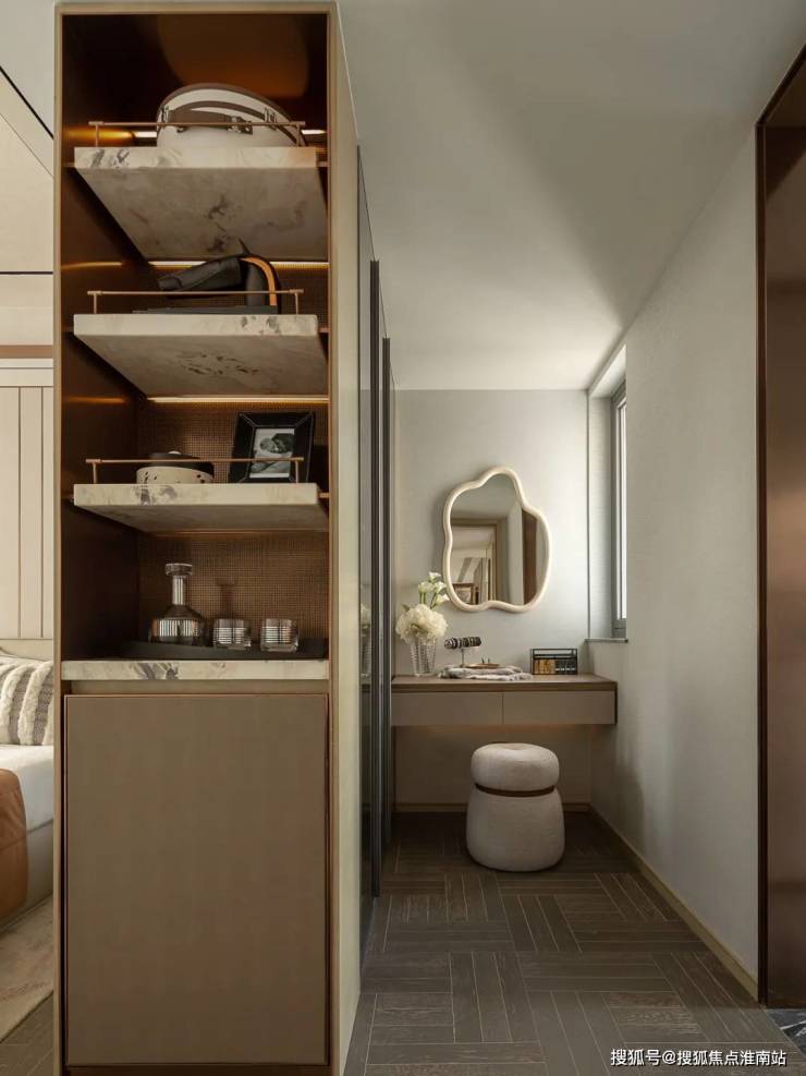 143㎡户型,客厅的吊顶设计与金属收边,以现代手法平衡了石材的厚重感, 黄玉电视背景墙勾勒自然纹理,整墙书柜兼顾收纳与艺术陈列。主卧以 米色与棕色为主调,米色护墙板通过竖向线条设计延伸视觉高度;儿童房以 柔和粉色为主调,整体布局兼顾多种功能,打造实用又充满欢乐的成长空间。