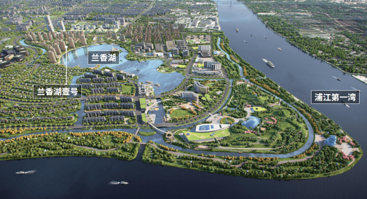 黄浦江从东、南两面环抱整个兰香湖社区,东北侧有兰香湖作为水系中心,钥匙形的外观寓意“以智慧之钥,开启生活之门”。