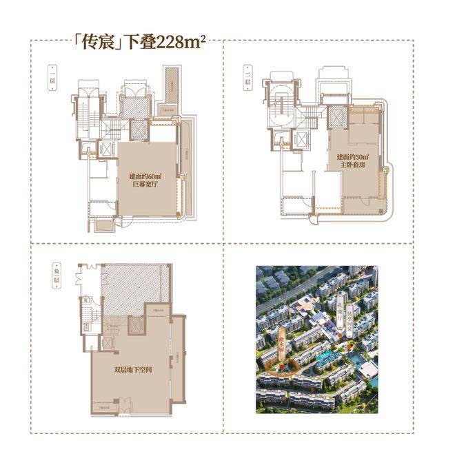 「传宸」下叠228㎡,拥享建面约110㎡南向花园(边厅)、建面约60㎡巨幕宽厅、建面约50㎡主卧套房以及建面超200㎡双层地下空间,一层一境,进阶三代阖居生活;