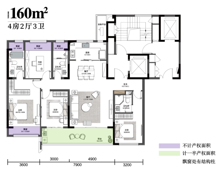 建面约160㎡四房两厅三卫,同样双套房设计,给予家庭成员平权。超大四开间朝南、约14.7米南向面宽、约7.9米观景阳台,实现景观采光的更大化。