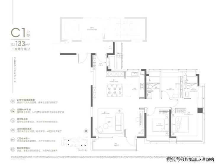 133㎡可以说是108㎡的进阶款,同样的三房两厅两卫,大面宽横厅、半开放式厨房设置岛台,加上主卧L型飘窗,再一次验证了华润置地豪宅化的产品思路。