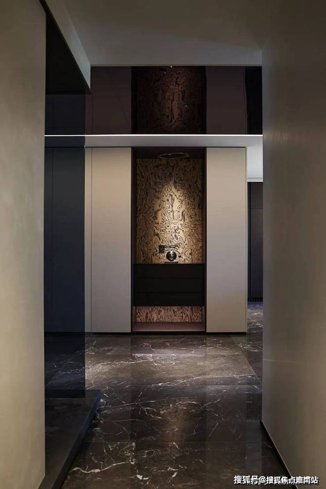 过道处,【爱力蒙特∙黑金帝国石】与木纹砖的巧妙过渡,暖色调的灯光赋予空间沉稳的气质,哑光暗色的柜体力求风格统一,彰显简净高级,恰到好处的场域共鸣,定格了人与空间最佳尺度的平衡.