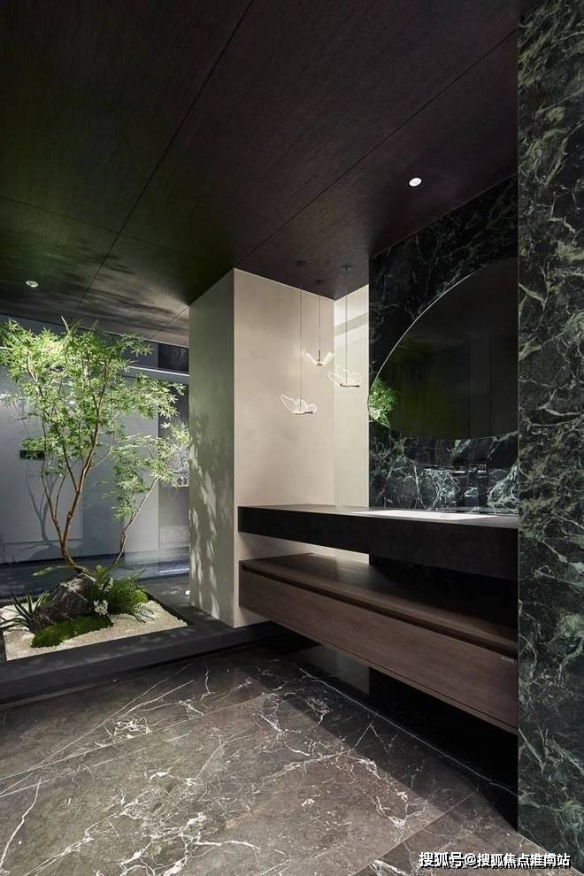 设计师采用【爱力蒙特∙黑金帝国石】地面通铺,独特的浓郁黑色底色,自带无尽视野纹理舞动地闯入,多元文化沉淀的石材,在灯光的映衬下,赋予空间奢雅而高级的气息.推动人与场域建立共鸣与自洽的美好连接.