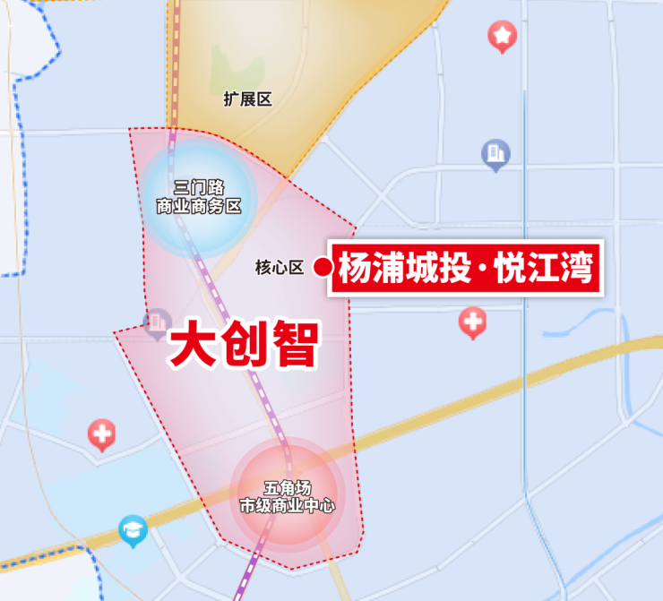 项目处于中部大创智核心区内,根据杨浦区规划,大创智和杨浦滨江、环同济、大创谷一样,是杨浦重点发展的四大区域之一。
