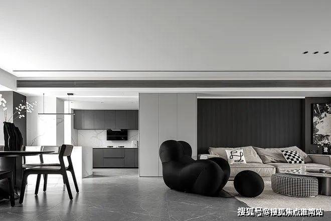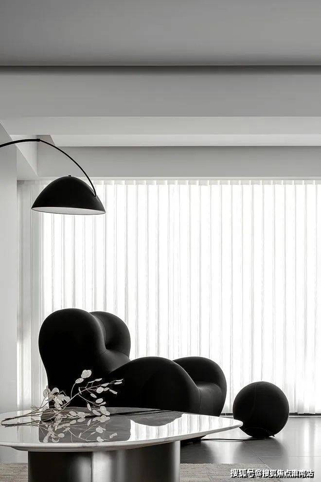 空间布局重新打造,传统设计的隔断被拆除,通透感中,各区域联系更紧密。黑色沙发奇特的造型带来动感和时尚元素,沙发上有凸起设计,提高支撑感,让居者小憩时更加舒适,体会时光温柔。