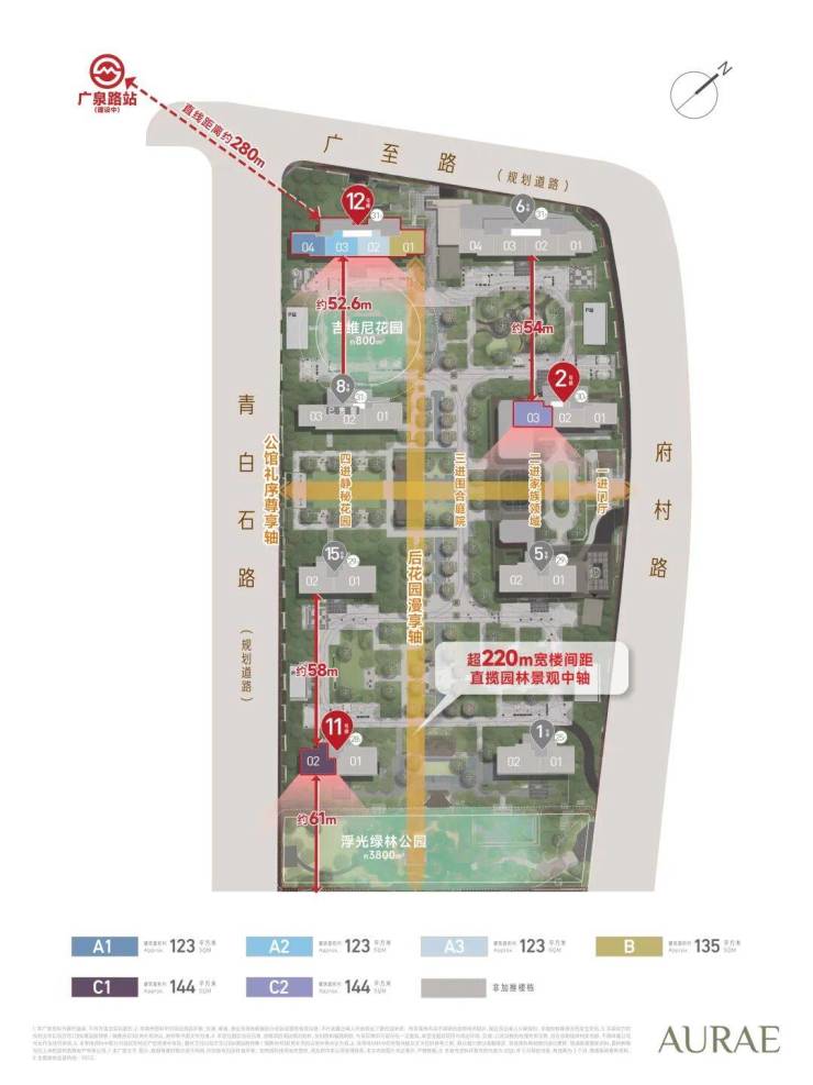 整体规划中,纵向中央绿轴超200米,横向景观轴约140米,南北楼间距约50-57米,东西间距也多超过44米,实现更好的采光通风效果与景观视野!