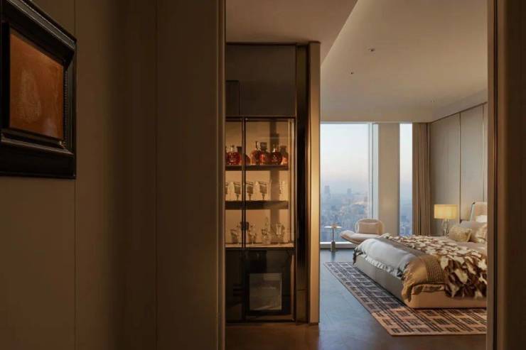 走道端处香槟色金属雕塑,形类城市高楼,又若恋人彼此依偎; 全采光套房拥揽白日上海黄浦的忙碌、繁华,也收藏夜晚灯火阑珊的宁静、美好。