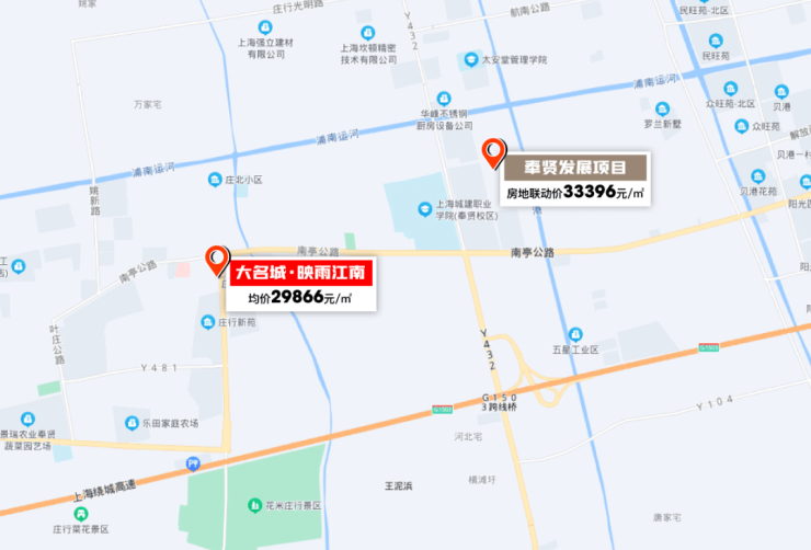 老闵行价格已达到5.9万/㎡,奉贤新城价格也在4万/㎡+,大名城·映雨江南均价29866元/㎡,价格差非常明显。