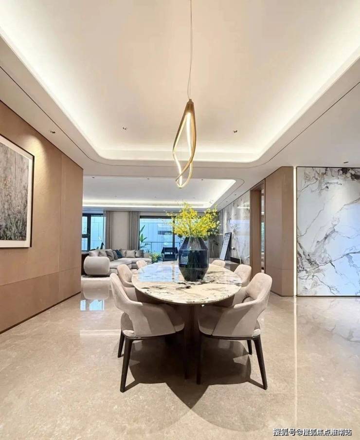 比起中规中矩的直线,弧形施工工艺更复杂、造价更高,却多了几分灵动轻盈!这种弧形的元素不只是在样板间里,在售楼处也能经常看到,比如电梯厅。