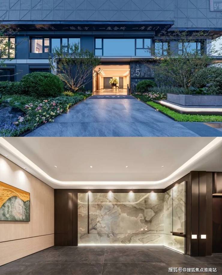 单元门臻选名贵石材搭配香槟金铝板,入户大堂精选翡翠绿岩板,定制3D圆弧吊顶,墙面局部仿木纹铝板铺贴,辅以透光云石导引,电梯轿门金属蚀刻雕纹(仅一层和负一层配置),高定精奢入户大堂。