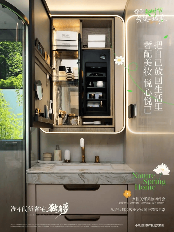 更难得的是,项目首创的 「她享主义」 空间,精配 美妆4件套(美妆龙头、美妆镜柜、美妆冰箱、双补光照明)。女主人清晨的梳妆打扮,从此拥有更舒适、更专业的专属空间。