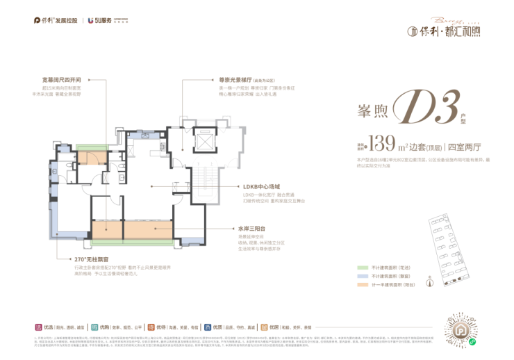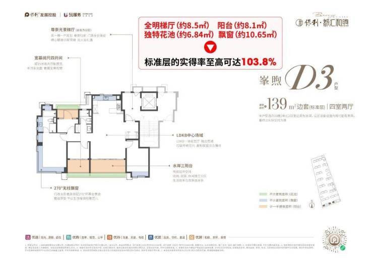 至高约103.8%实得率:项目建面约139㎡户型通过全明梯厅(约8.5㎡)、阳台(约8.1㎡)、独特花池(约6.84㎡)、飘窗(约10.65㎡)等赠送面积,标准层的实得率至高可达103.8%,相当于直接赠送了超200万的空间价值!