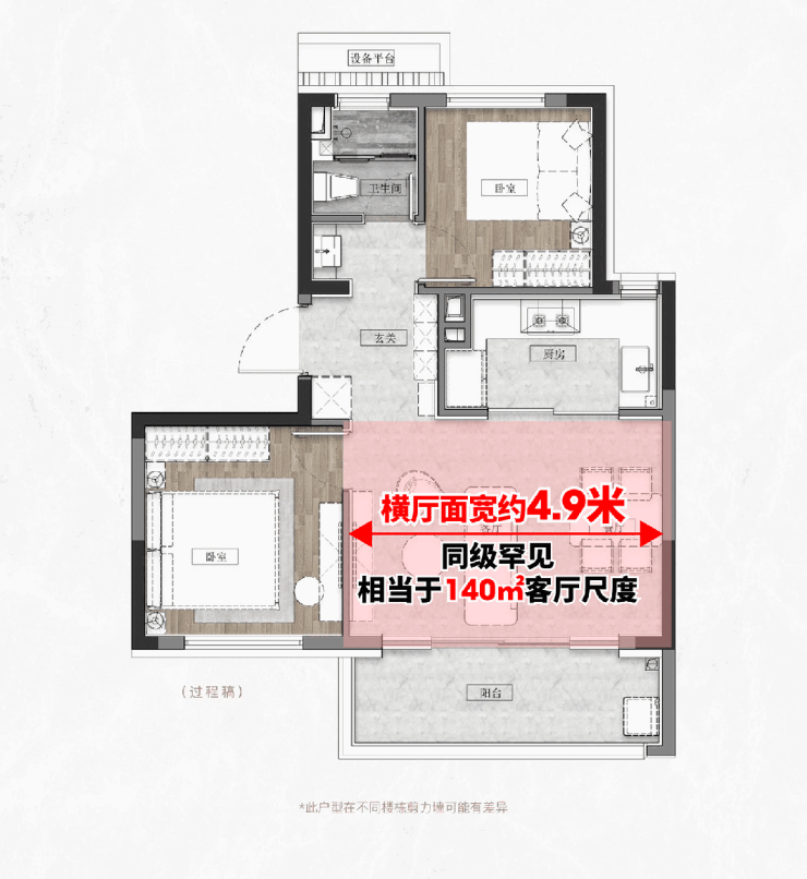 建面约72㎡2房,客餐厅大横厅设计,面宽达到惊人的约4.9米,相当于市场140㎡客厅尺度。