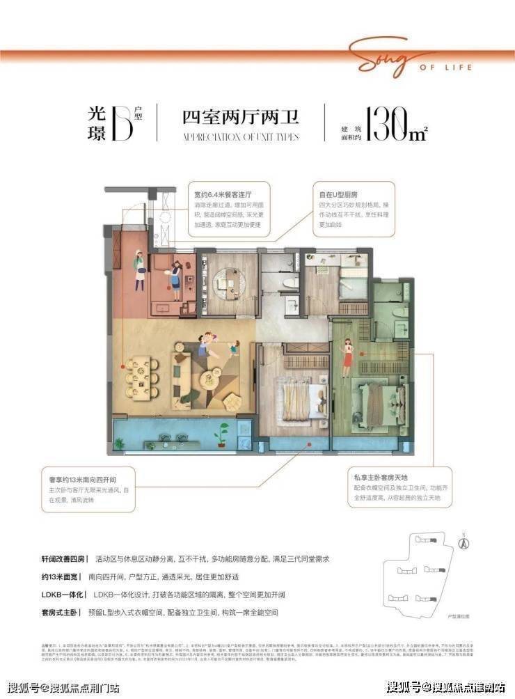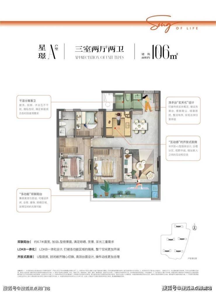 约106㎡户型点评:双联阳台约6.7米面宽,加设L型俯景面,满足晾晒、赏景、采光三重需求,LDKB一体化设计,打破各功能区域的隔离,整个空间更加开阔,开放式厨房U型厨房,封闭敞开随心切换,高效台面设计,操作动线更加合理