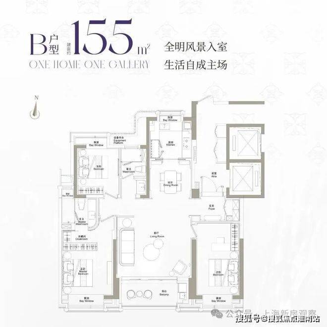建面约155㎡三房两厅两卫:主力入门户型,南北通透,全明格局,适合改善型家庭;