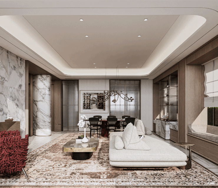 用料上,部分以冰火板+岩板打造的 车行道廊柱、 仿透光云石定制车牌号、部分主干道 全铝板吊顶,无不显示出业主的归家气场。
