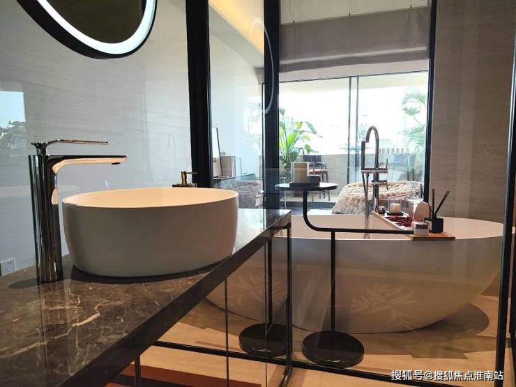 套内卫生间拥有左右双梳洗台,大浴缸、智能马桶。全透明玻璃浴室旨在创造一个开放、通透和豪华的浴室空间。将浴室与卧室融为一体,打破了传统上将浴室作为私密空间的观念。当然也可以通过使用帘子或百叶窗来解决隐私问题。