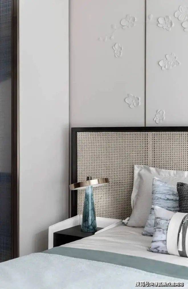走进主卧空间,更见一派清雅之美。石膏皮雕式的床头背景墙,将梅花以立体化的形式展现,赋予空间更多的画意感。