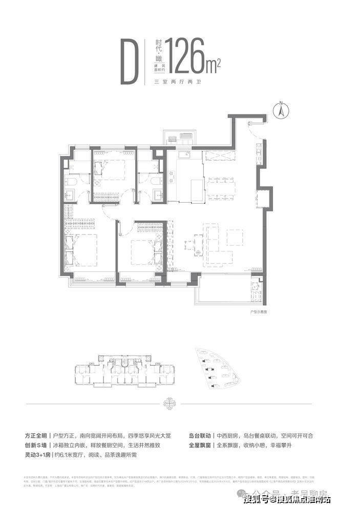 建面约126m²三房两厅两卫户型,南向3+1面宽横厅设计,让空间更加随心而变。主卧双台盆配置,用空间拥抱自然中的无限自在。
